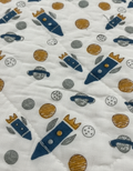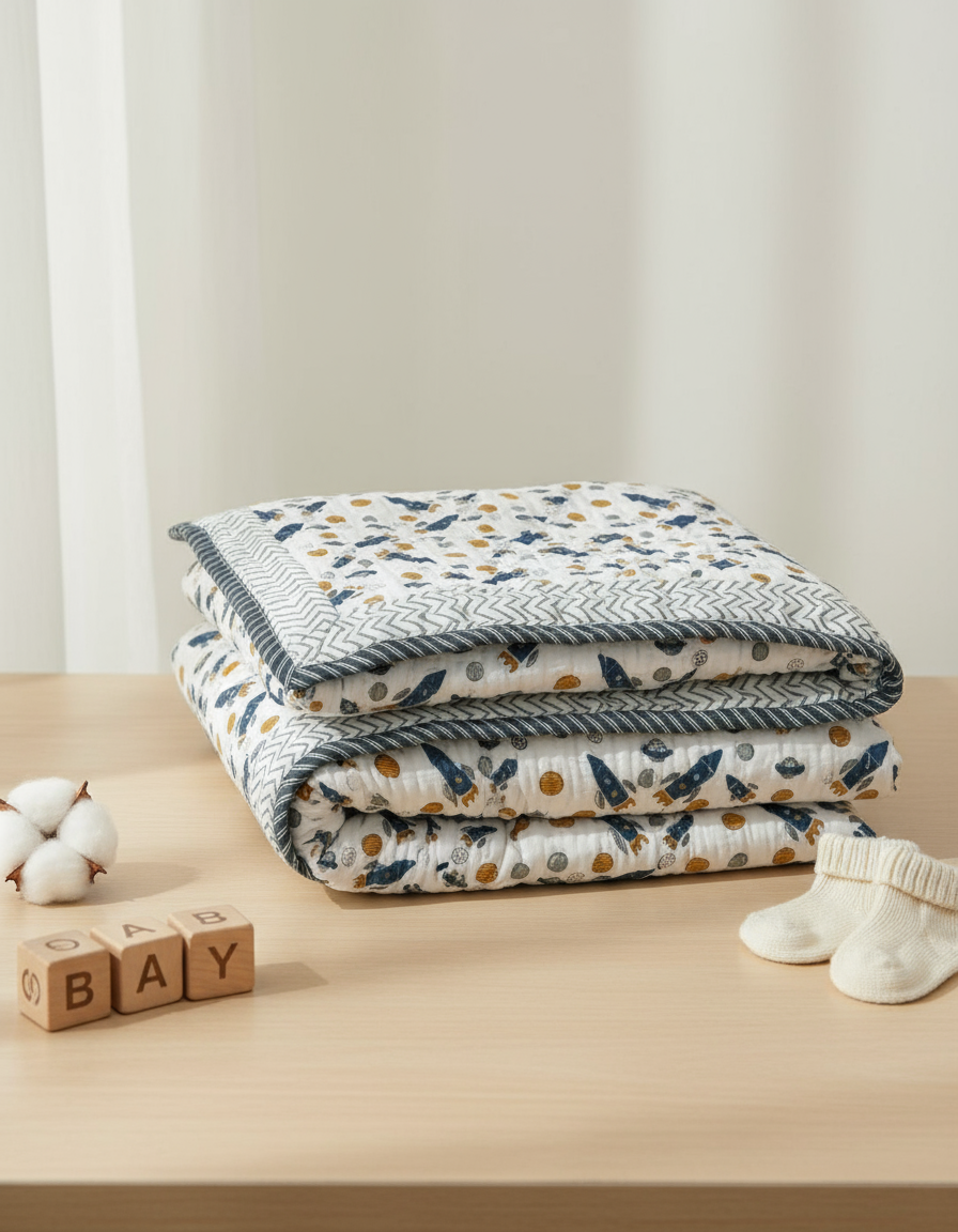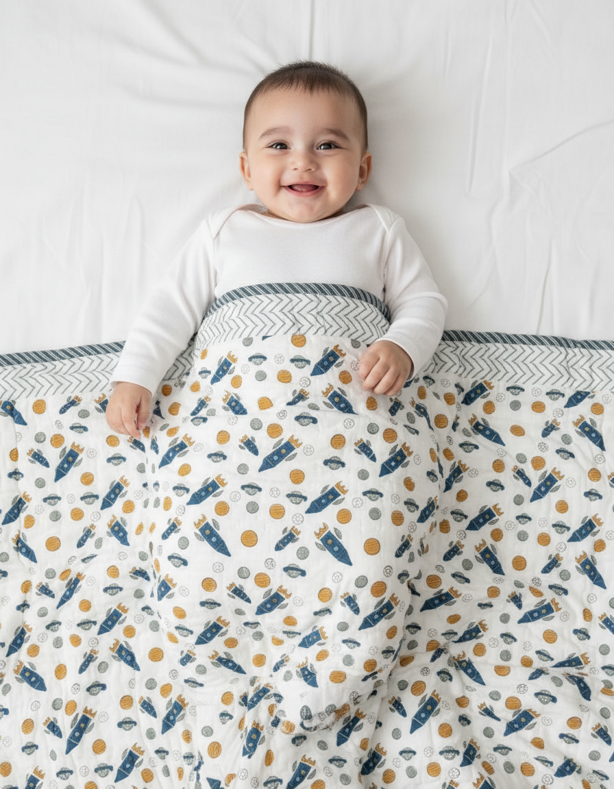 Turn bedtime into a cosmic journey with our Blast Off to Dreamland Quilt! Designed with playful rockets, stars, and suns, it’s made from soft cotton fabric with a cozy cotton filling. Hand quilted and hand printed, it’s lightweight yet warm — ideal for both AC rooms and cooler nights. Designed to suit babies, toddlers, and kids aged 0 to 6 years, it keeps your little one comfy through every stage. Easy to wash, durable, and gentle on sensitive skin — it’s truly out of this world!