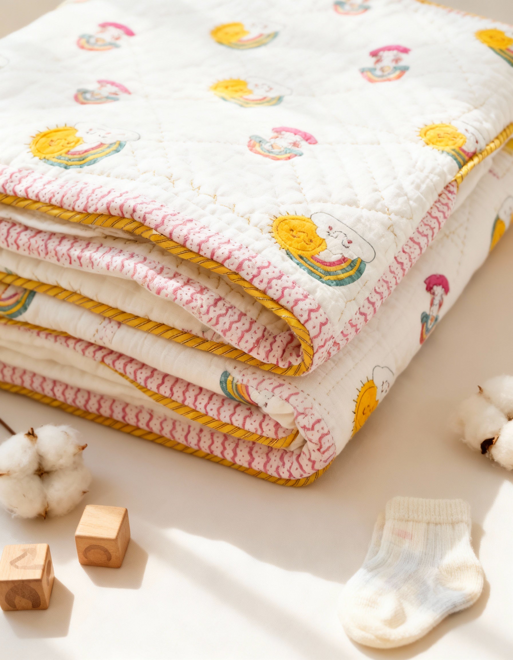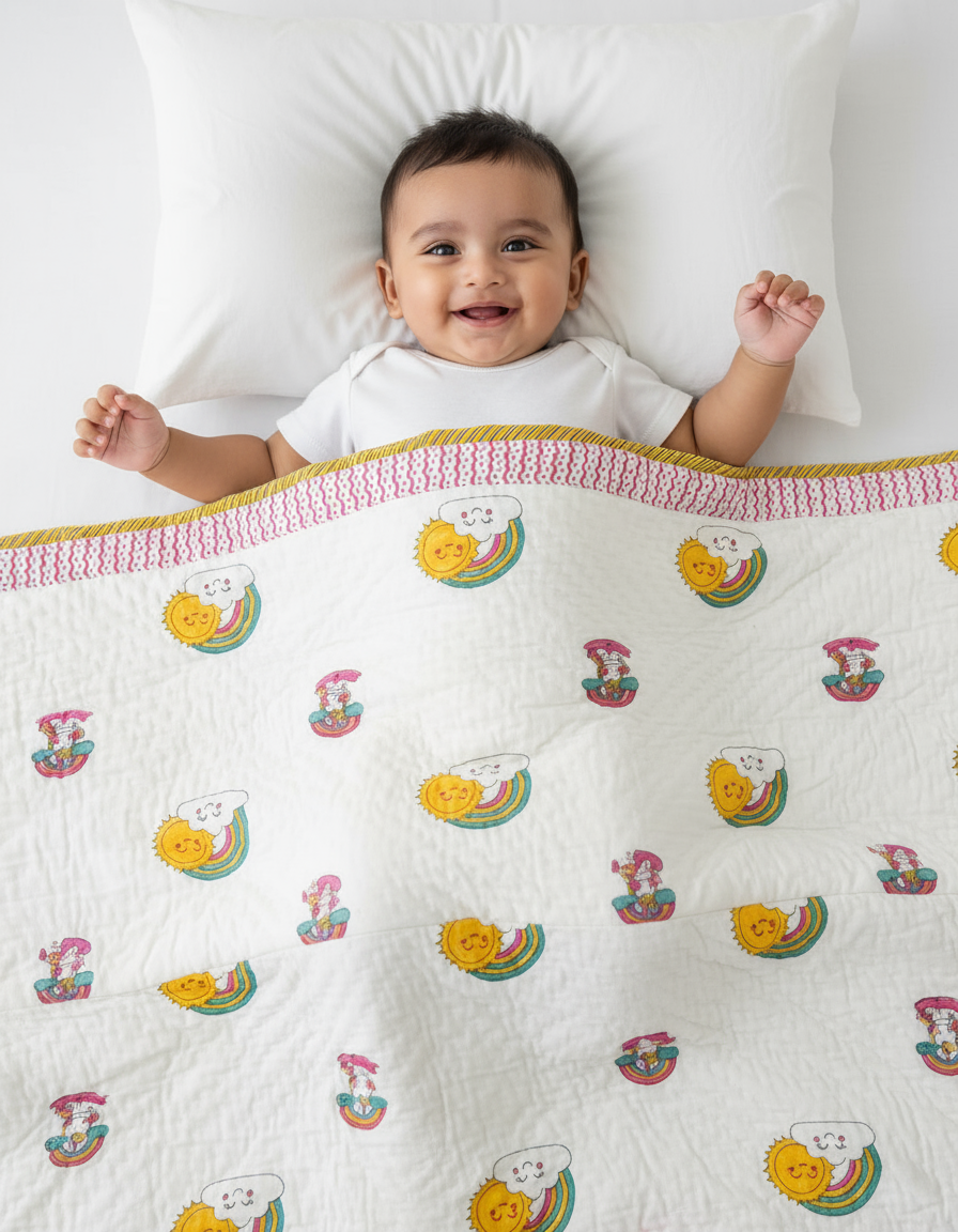 Our Chase the Rainbow Quilt brings sunshine, clouds, and rainbows together for the sweetest dreams. Crafted with 100% cotton fabric and filling, it’s soft, airy, and gentle on delicate skin. Hand block printed and hand quilted, this lightweight yet warm quilt keeps your little one snug without overheating. Designed to suit babies, toddlers, and kids aged 0 to 6 years, it keeps your little one comfy through every stage. Easy to wash and easy to love — it’s a bright, joyful essential for every nursery.
