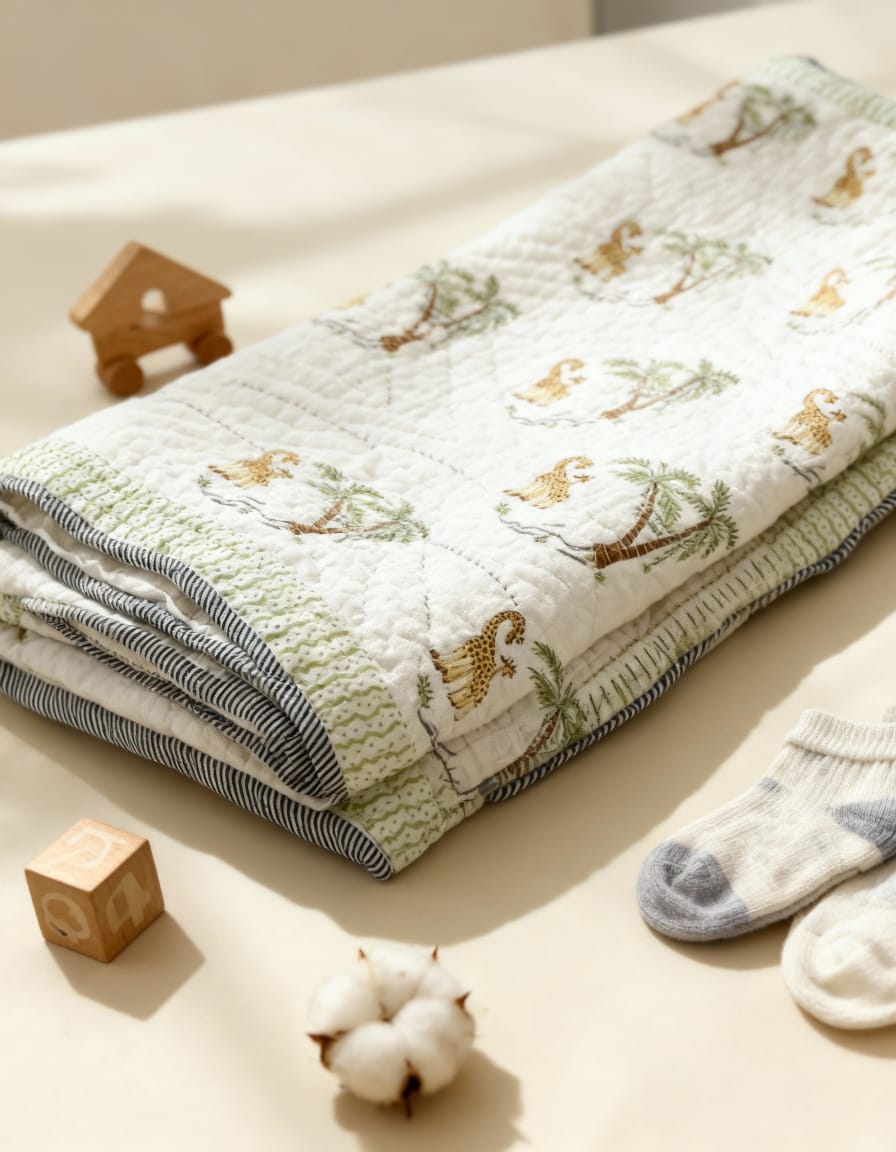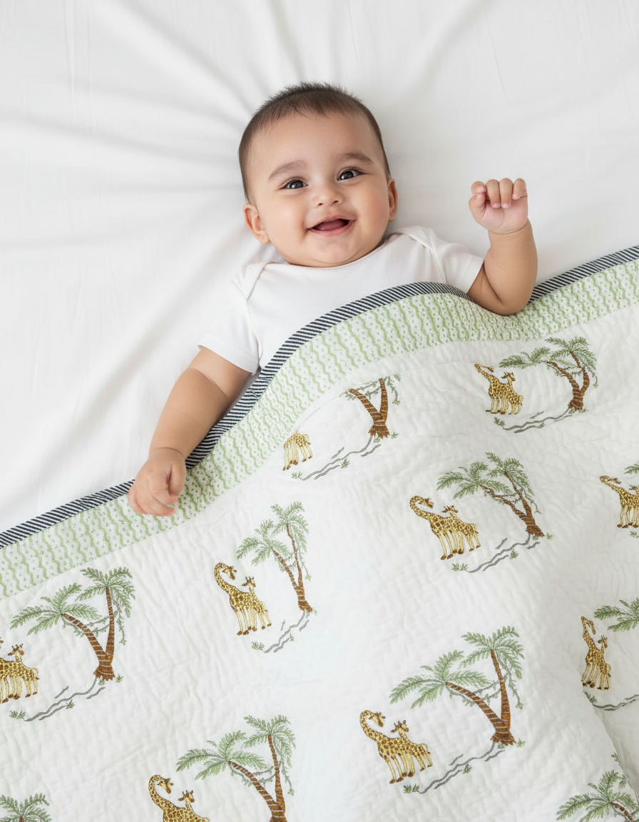 Let your little one snuggle into adventures with our Into the Wild Quilt. Featuring playful giraffes and lush trees, it’s hand block printed and quilted on 100% cotton for pure comfort. Lightweight, breathable, and warm — it’s perfect for daily use in all seasons.