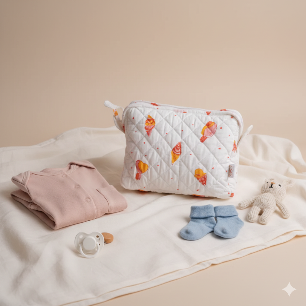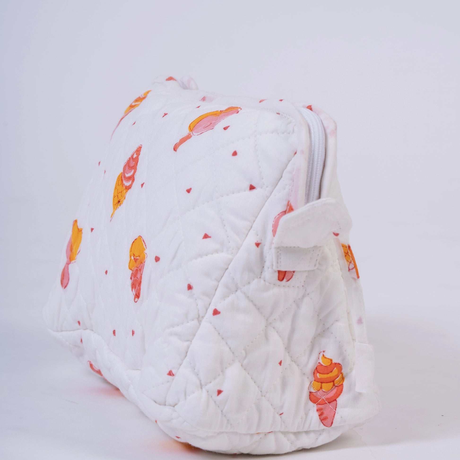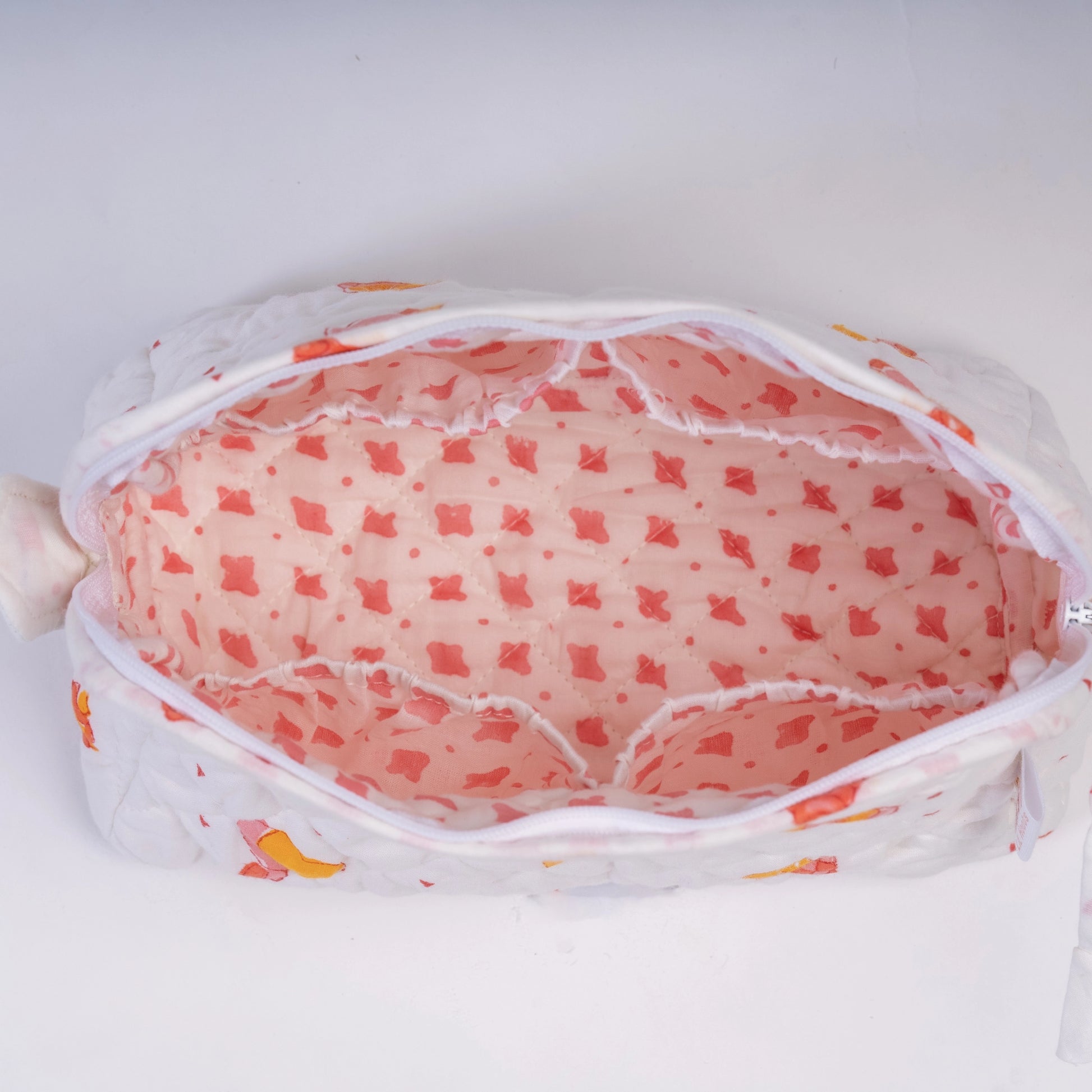 Our aesthetically appealing 100% cotton pouches. These quilted pouches feature a charming print, adding a touch of whimsy to your everyday essentials. With a convenient zipper opening at the top, these pouches are both practical and stylish. Our cotton pouches that are perfect for every day and are also great travel companions.