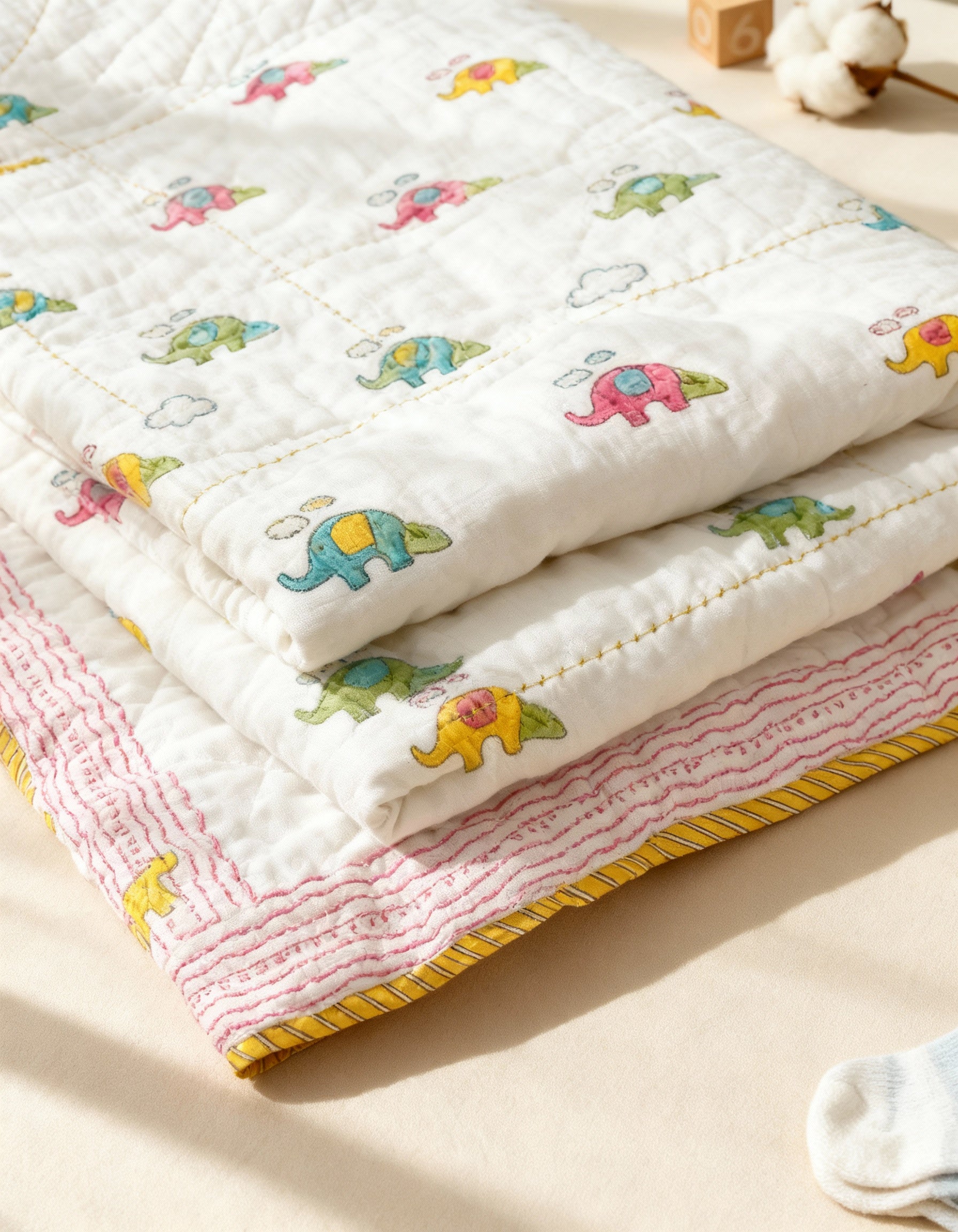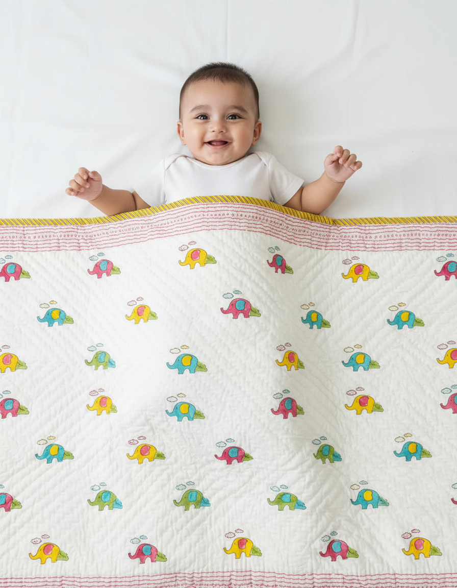 Bring home joy and colour with our Colourful Elephant Quilt! Made from pure cotton fabric and filling, it’s hand block printed and hand quilted to ensure lasting softness and warmth. Lightweight yet cozy, this quilt is perfect for both nap time and nighttime. Designed to suit babies, toddlers, and kids aged 0 to 6 years, it keeps your little one comfy through every stage.